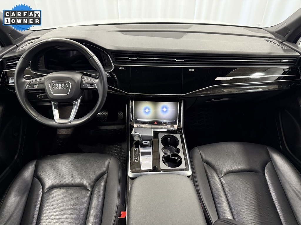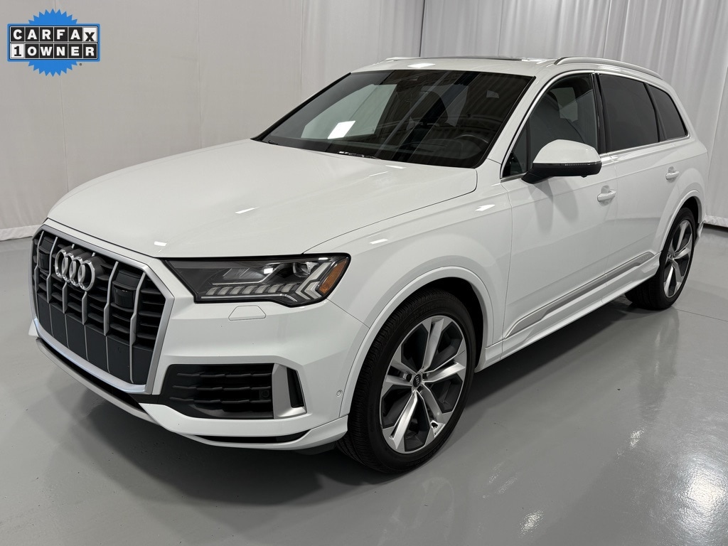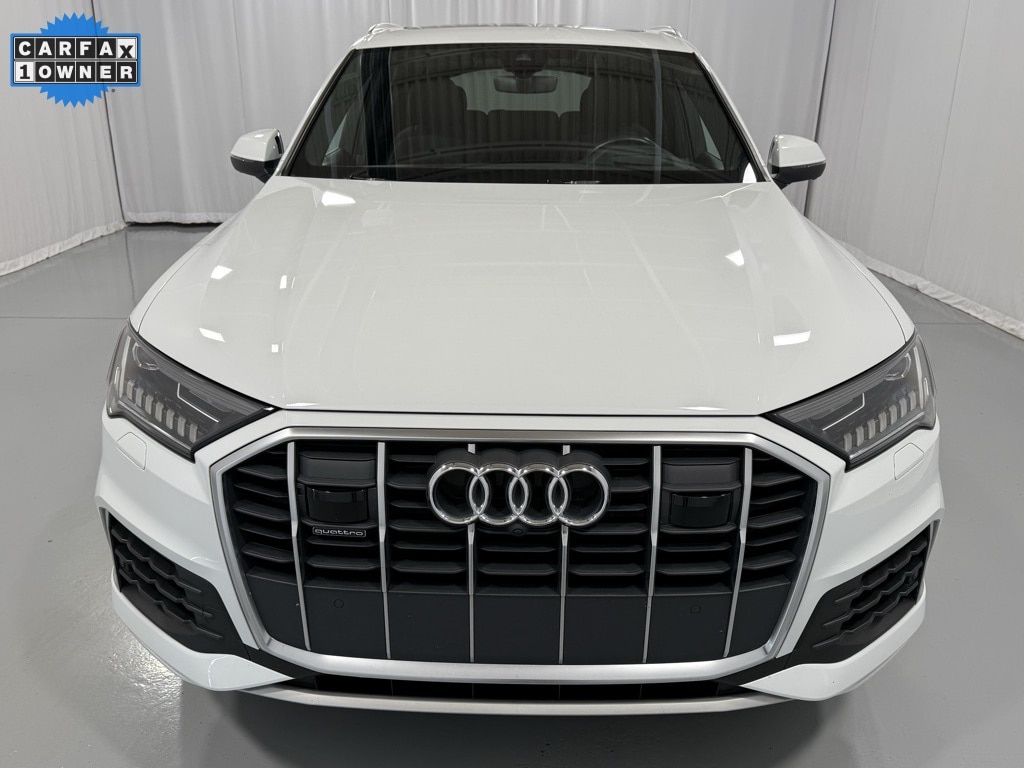 This 2021 Audi Q7 55 Prestige quattro AWD is Glacier White Metallic with Black Leather seats. It is equipped with the Prestige Package (Convenience Package (Ambient Interior Lighting, Audi Phone Box with Wireless Charging, Topview Camera System, Heated Auto-Dimming Power Folding Exterior Mirrors), Executive Package (4-Zone Automatic Climate Control, Audi Active Lane Assist with Emergency Assist, Audi Adaptive Cruise Assist with Traffic Jam Assist, Heated/Ventilated Front Seats, Heated Rear Seats, Sunshades in Rear Doors/Side Windows and Tailgate), Bang & Olufsen 3D Premium Sound, Comfort Adaptive Air Suspension, Contour/Ambient LED Interior Lighting, Head-Up Display, Dual-Pane Acoustic Side Window Glass, Matrix-Design LED Headlights, Power Soft-Closing Doors, Intersection Assist and Traffic Sign Recognition), 21" Audi Sport 5-Double Spoke Modular Design Wheels, Audi Beam - Rings, and much more!